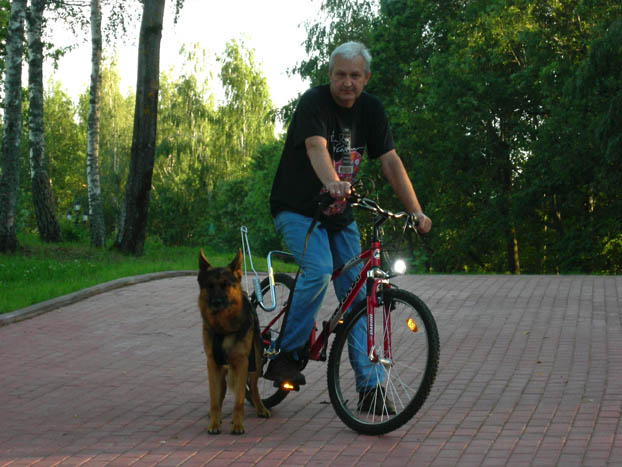 Еще пару раз пробовал Нирку "прикреплять" к велосипеду. Поначалу он как и раньше сильно тянул, потом все же мне удавалось находить некий темп, чтобы он рысил, но все же Настя уговорила меня, что велоспрингер - снаряд не для овчарок и тем более не для Ниркиного темперамента... Увы, но пришлось с ней согласиться.